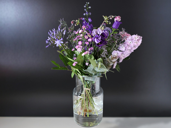 Dit paarse veldboeket straalt elegantie en rust uit. Met een verfijnde mix van paarse bloemen, lila tinten en zachtroze accenten oogt het boeket rijk en harmonieus. De losse samenstelling en verschillende hoogtes geven het de natuurlijke charme van een echt veldboeket.
