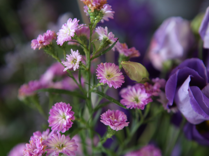 Een stijlvol boeket met zachte lichtroze rozen en speelse paarse bloemen – een perfecte balans tussen romantiek en frisheid